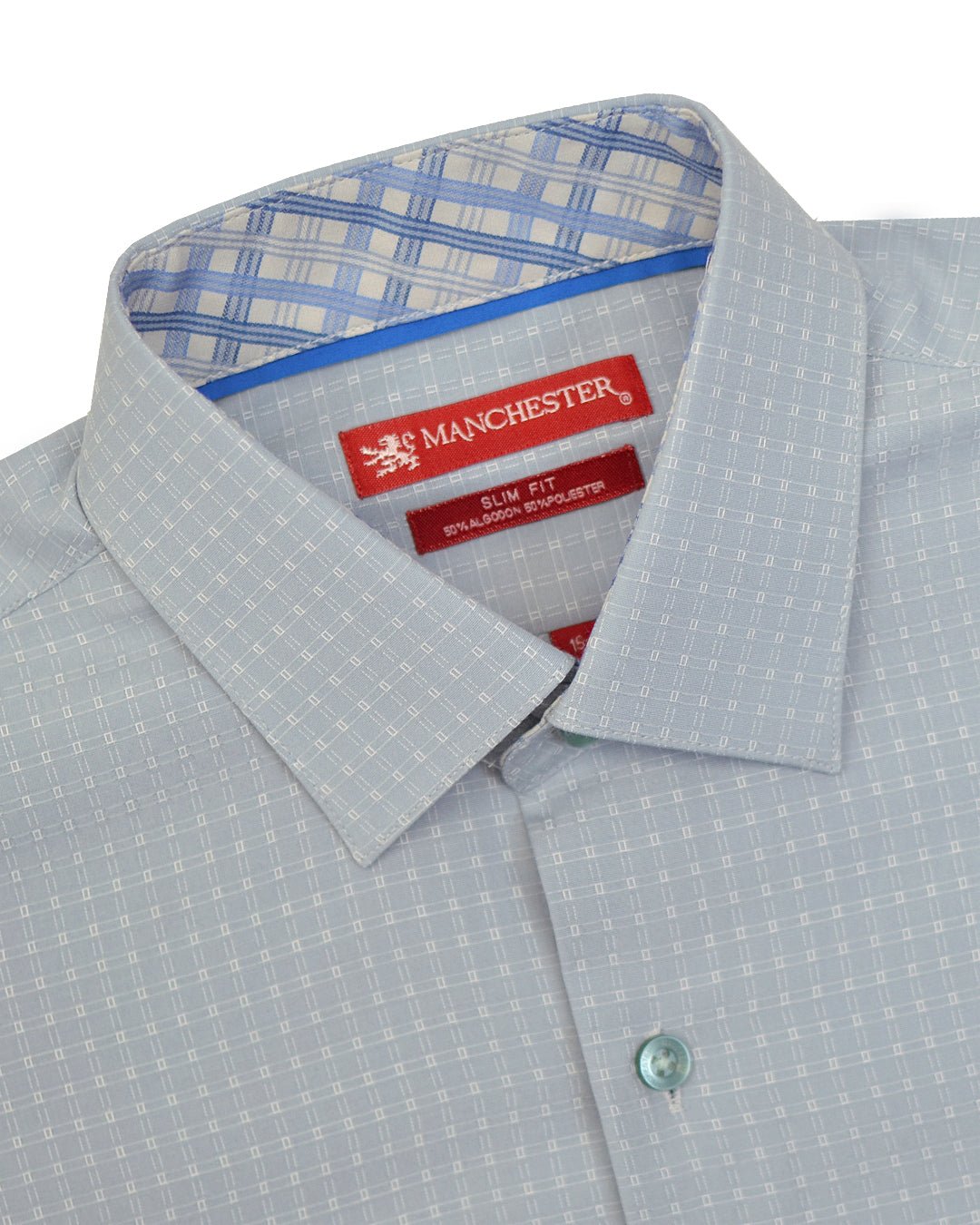 La Camisa de Vestir Slim Fit de Manchester, confeccionada con una mezcla de 50% algodón y 50% poliéster, ofrece una textura suave y resistente que se adapta perfectamente a tu cuerpo. Su diseño ajustado es ideal para cualquier ocasión formal.